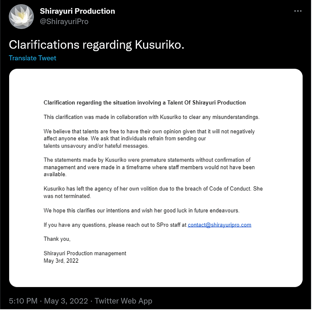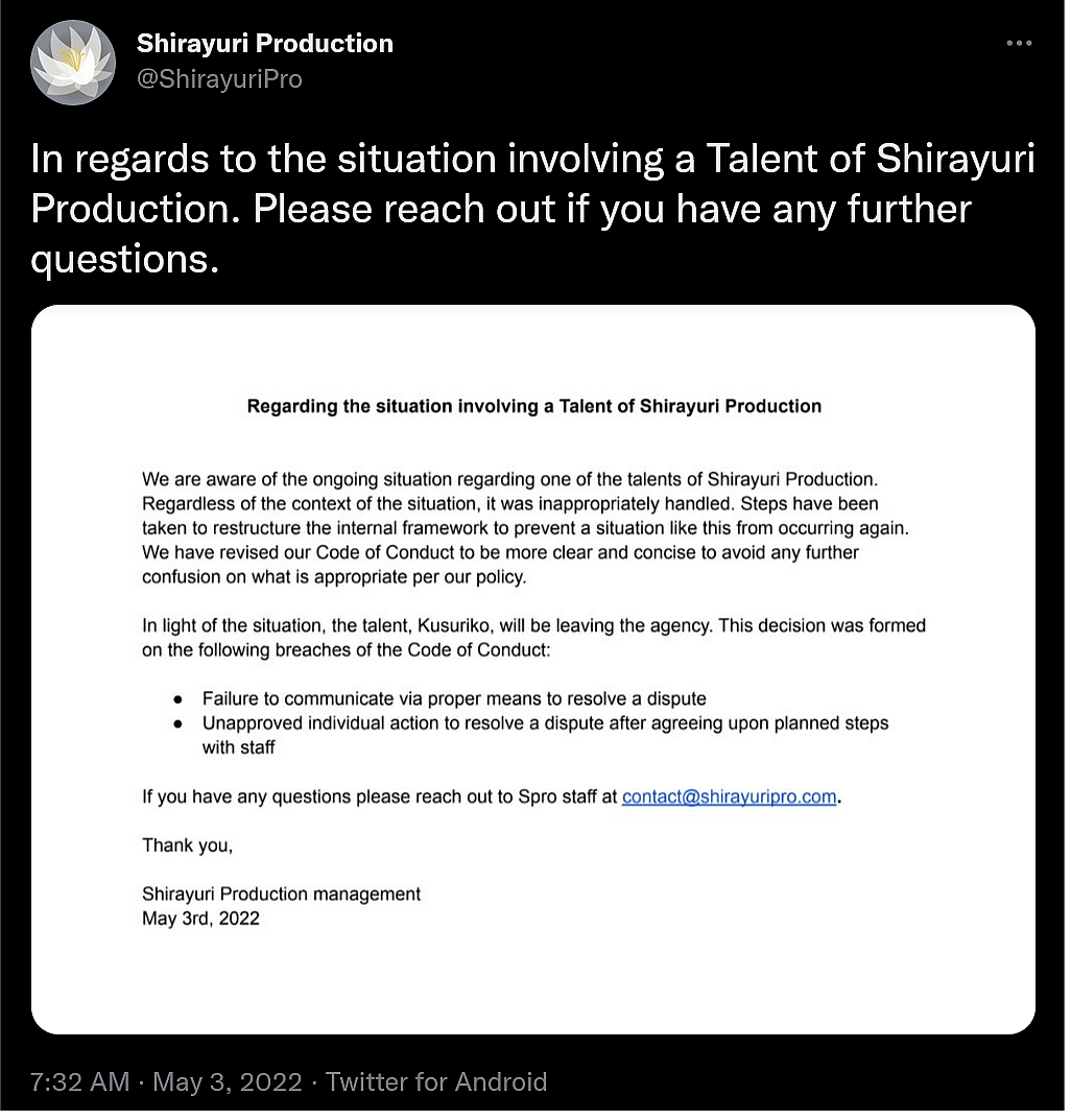 The statement concluded, “In light of the situation, the talent Kusuriko, will be leaving the agency. This decision was formed on the following breaches of the Code of Conduct: Failure to communicate via proper means to resolve a dispute” and “Unapproved individual action to resolve a dispute after agreeing upon planned steps with staff.”