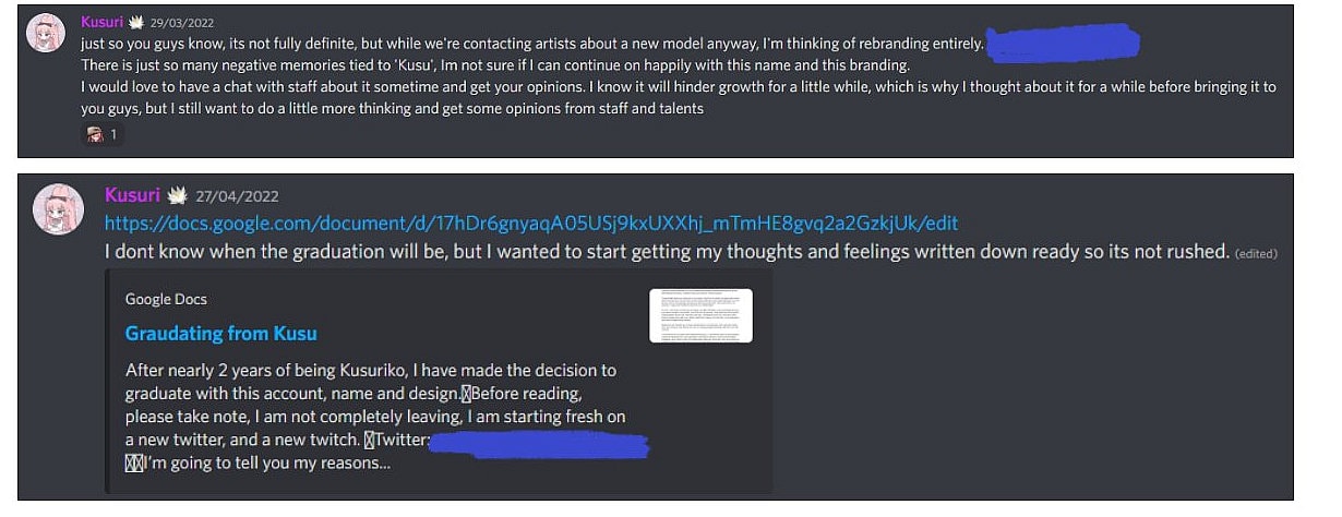Sharing the below screenshots from late March and late April, Kusuriko concluded, “If anyone wishes to question the validity of my plans to graduate: This screenshot proves it’s been in the works for over a month prior to any controversy.”