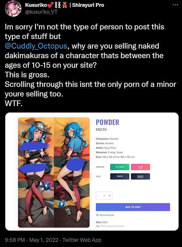 “I’m sorry I’m not the type of person to post this type of stuff but @Cuddly_Octopus, why are you selling naked dakimakuras of a character that’s between the ages of 10-15 on your site?” she asked before accusing, “This is gross. Scrolling through this isnt the only porn of a minor you’re selling too. WTF.”