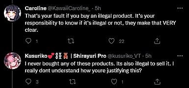 @KawaiiCaroline_ fired back, “That’s you fault if you buy an illegal product. It’s your responsibility to know if it’s illegal or not, they make that VERY clear.”