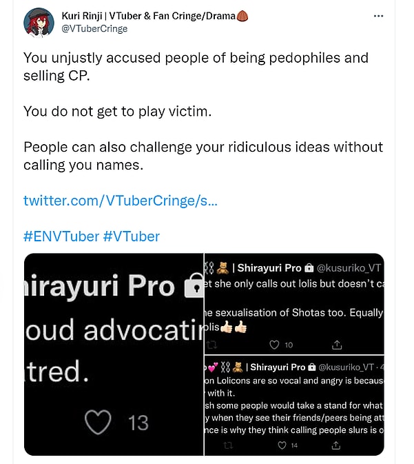 “You unjustly accused people of being pedophiles and selling CP,” said @VtuberCringe, sharing screenshots of three additional Kusuriko tweets. “You do not get to play the victim. People can also challenge your ridiculous ideas without calling you names.” This applies to the rest of you on twitter.