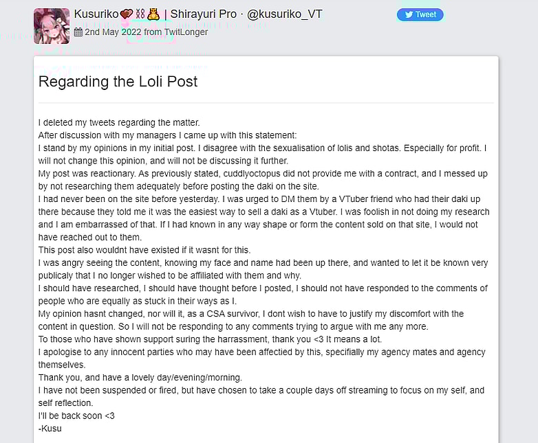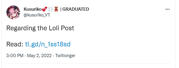 Eventually, as more and more fans began to push back against Kusuriko continued dumping of toxic waste into their community, the Vtuber deleted all of their tweets and released a statement “regarding the Loli Post.”