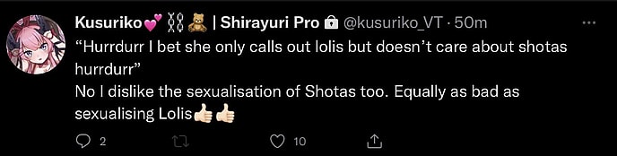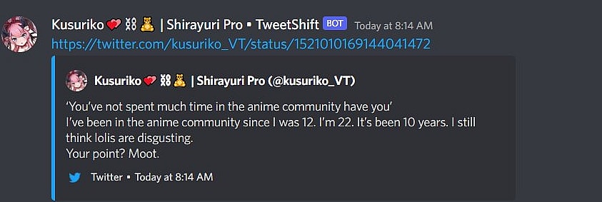 In another, Kusuriko mocked @KawaiiCarolines_ response to their initial tweet, writing, “‘You’ve not spent much time in the anime community have you’ I’ve been in the anime community since I was 12. I’m 22. It’s been 10 years. I still think lolis are disgusting. Your point? Moot.”