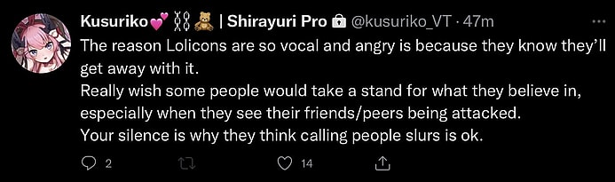 And “The reason Lolicons are so vocal and angry is because they know they’ll get away with it. Really wish some people would take a stand for what they believe in, especially when they see their friend/peers being attacked. Your silence is why they think calling people slurs is ok” – completely missing both that people were angry because she generalized a group of people as pedos and that most of her fellow Vtubers were on the side of fans.