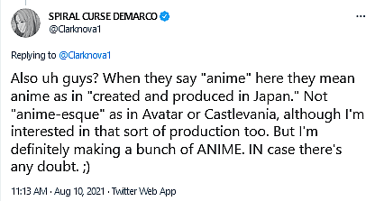 “Not ‘anime-esque’ as in Avatar or Castlevania, although I’m interested in that sort of production too,” he clarified. “But I’m definitely making a bunch of ANIME. IN case there’s any doubt. ;)”