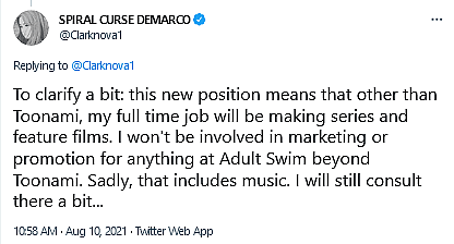 DeMarco expanded on his new role in a thread published to his personal Twitter account, writing, “To clarify a bit: this new position means that other than Toonami, my full time job will be making series and feature films.”