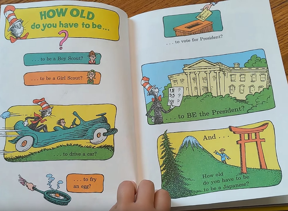 This children’s quick book was assumedly removed for the inclusion of an image of a Japanese man wearing a traditional conical hat alongside the question “How old you have to be to be a Japanese?”