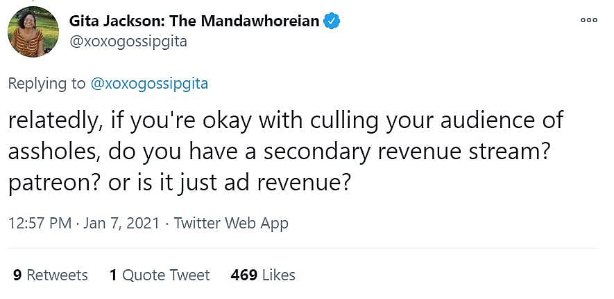 In a follow-up she wrote, “relatedly, if you’re okay with culling your audience of assholes, do you have a secondary revenue stream? patreon? or is it just ad revenue?”