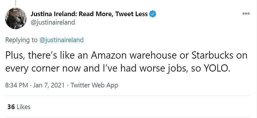 She added in a subsequent tweet, “Plus, there’s like an Amazon warehouse or Starbucks on every corner now and I’ve had worse jobs, so YOLO.”