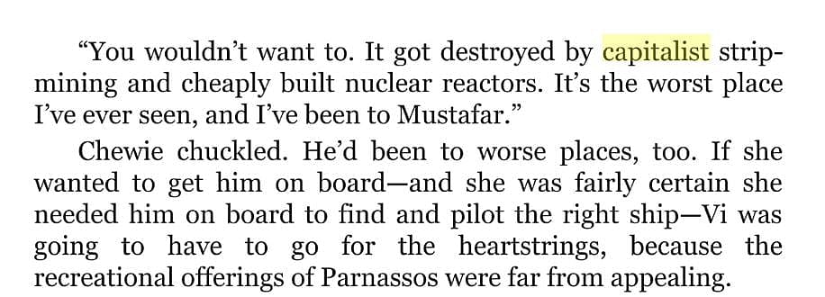When asked about Parnassos, Moradi states, “You wouldn’t want to. It got destroyed by capitalist strip-mining and cheaply built nuclear reactors. It’s the worst place I’ve ever seen, and I’ve been to Mustafar.”
