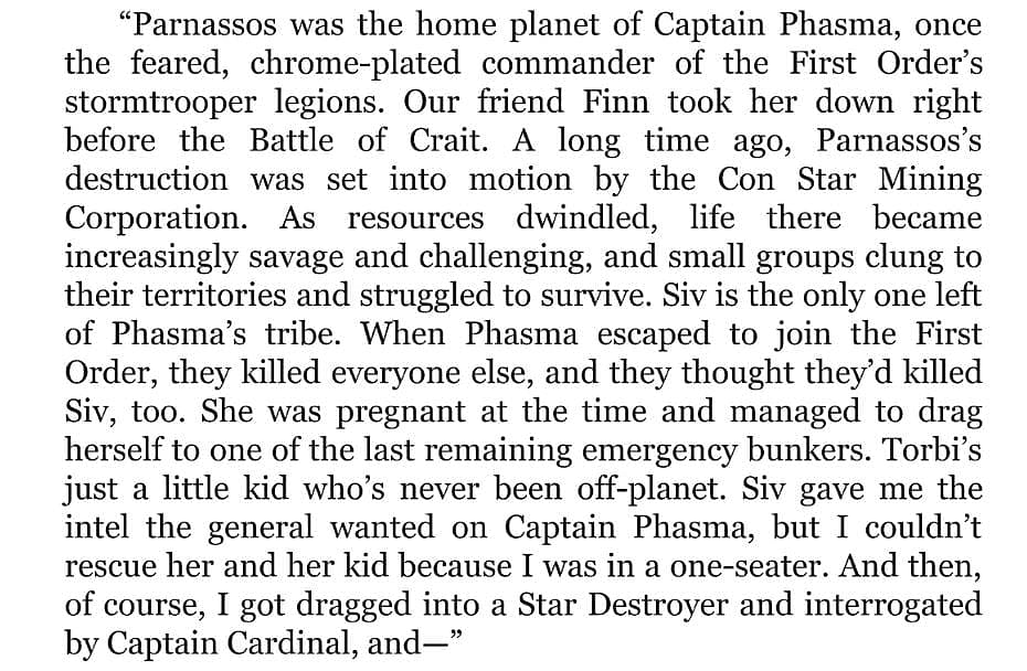She states, “Parnassos was the home planet of Captain Phasma, once the feared, chrome-plated commander of the First Order’s stormtrooper legions. Our friend Finn took her down right before the Battle of Crait.”