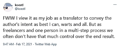 In the same vein, Cuneo stated that “FWIW I view it as my job as a translator to convey the author’s intent as best I can, warts and all. But as freelancers and one person in a multi-step process we often don’t have that much control over the end result.”
