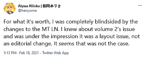 “For what it’s worth, I was completely blindsided by the changes to the MT LN,” wrote Niioka. “I knew about volume 2’s issue and was under the impression it was a layout issue, not an editorial change. It seems that was not the case.”