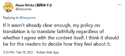 “If it wasn’t already clear enough, my policy on translation is to translate faithfully regardless of whether I agree with the content itself,” Niioka concluded. “I think it should be for the readers to decide how they feel about it.”
