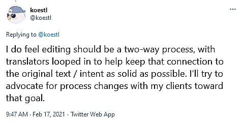 “I do feel editing should be a two-way process, with translators looped in to help keep that connection to the original text / intent as solid as possible,” he added. “I’ll try to advocate for process changes with my clients toward that goal.”