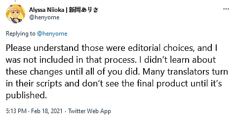 “Please understand those were editorial choices, and I was not included in that process,” Niioka added. “I didn’t learn about these changes until all of you did. Many translators turn in their scripts and don’t see the final product until it’s published.”