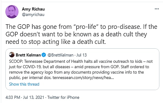 In response to this tweet and article, Richau wrote, “The GOP has gone from ‘pro-life’ to pro-disease. If the GOP doesn’t want to be known as a death cult they need to stop acting like a death cult.”