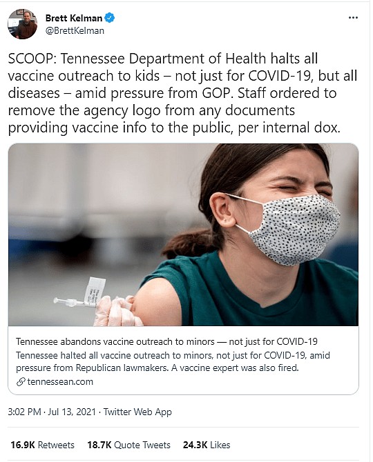 Recently on Twitter, Richau responded to a tweet from reporter Brett Kelman who wrote, “Tennessee Department of Health halts all vaccine outreach to kids – not just for COVID-19, but all diseases – amid pressure from GOP.”
