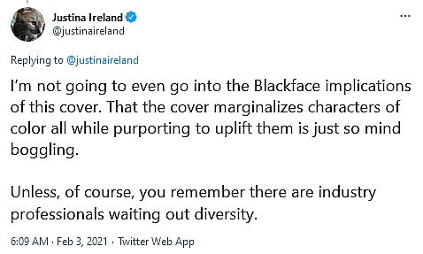 “I’m not going to even go into the Blackface implications of this cover. That the cover marginalizes characters of color all while purporting to uplift them is just so mind boggling,” she continued. “Unless, of course, you remember there are industry professionals waiting out diversity.”