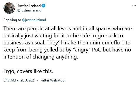“They’ll make the minimum effort to keep from being yelled at by ‘angry’ PoC but have no intention of changing anything,” Ireland added. “Ergo, covers like this.”