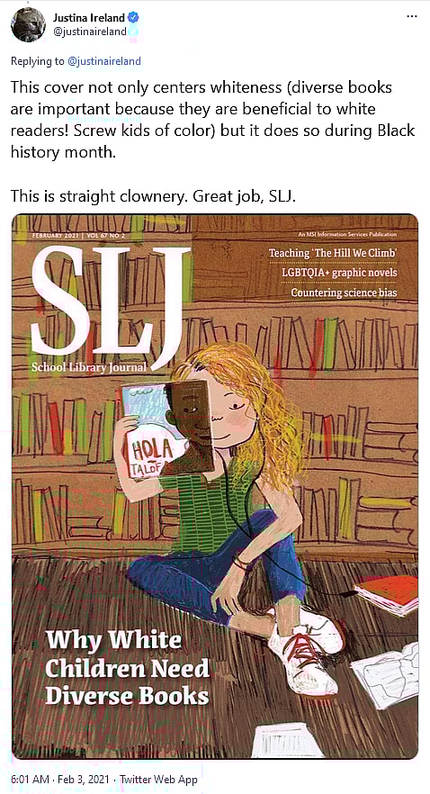 While Ireland is correct in her observation that the cover “centers whiteness,” it is because the topic at hand is specifically how white students could benefit from diverse books, a discussion that has been regularly and ironically promoted by critical social justice adherents for years.