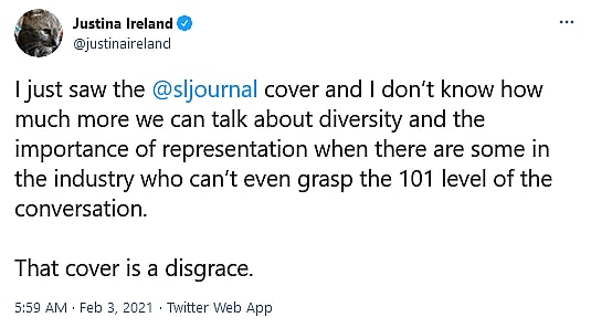 Ireland then explained that she took issue with the cover because it “not only centers whiteness (diverse books are important because they are beneficial to white readers! Screw kids of color) but it does so during Black history month,” adding that “This is straight clownery. Great job, SLJ.”