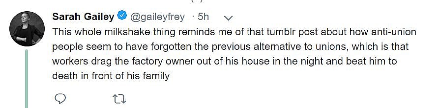 “This whole milkshake thing reminds me of that tumblr post about how anti-union people seem to have forgotten the previous alternative to unions, which is that workers drag the factory owner out of his house in the night and beat him to death in front of his family.”