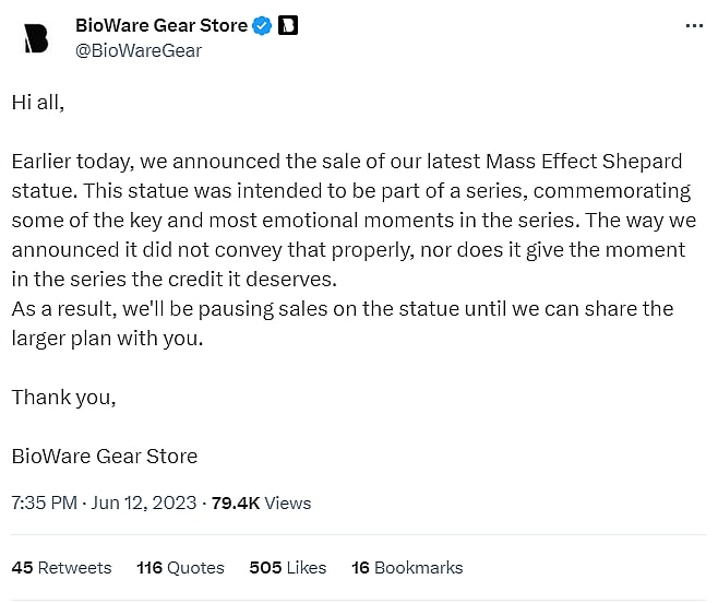 The official BioWare Gear Store Twitter explained the decision to stop sales, “Earlier today, we announced the sale of our latest Mass Effect Shepard statue. This statue was intended to be part of a series, commemorating some of the key and most emotional moments in the series.”