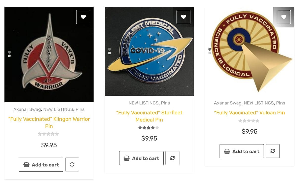 A set of three, each pin and features an emblem from a different Star Trek faction alongside a declaration that the wearer is either a “fully vaxx’d warrior” from the Klingon Empire, a “fully vaccinated” member of the Starfleet medical team, or a fully vaccinated servant of the Vulcan High Command who believes that “science is logical.”