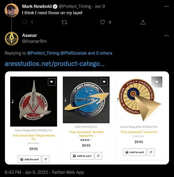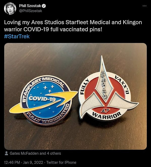 The pins were brought to widespread attention on January 9th, courtesy of a tweet made by Lucasfilm Creative Art Manager Phil Szostak wherein he exclaimed, “Loving my Ares Studios Starfleet Medical and Klingon warrior COVID-19 full vaccinated pins!”