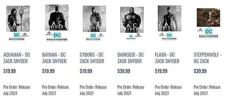 According to the listing, Batman, Superman, Flash, Aquaman, and Cyborg are 7-inch figures costing $19.99 and will be available for pre-order ahead of their scheduled release in July.