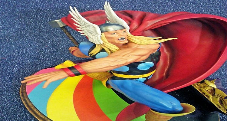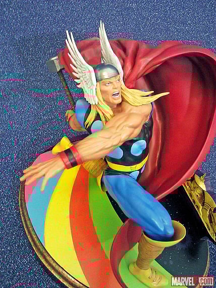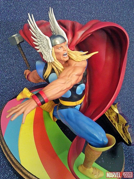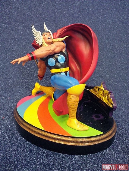 The Thor statue is based on a famous 1969 cover image of The Silver Surfer #4 by John Buscema and inked by Sal Buscema. Thos is wearing his classic outfit as he swings his hammer preparing to launch it at the absent Silver Surfer.