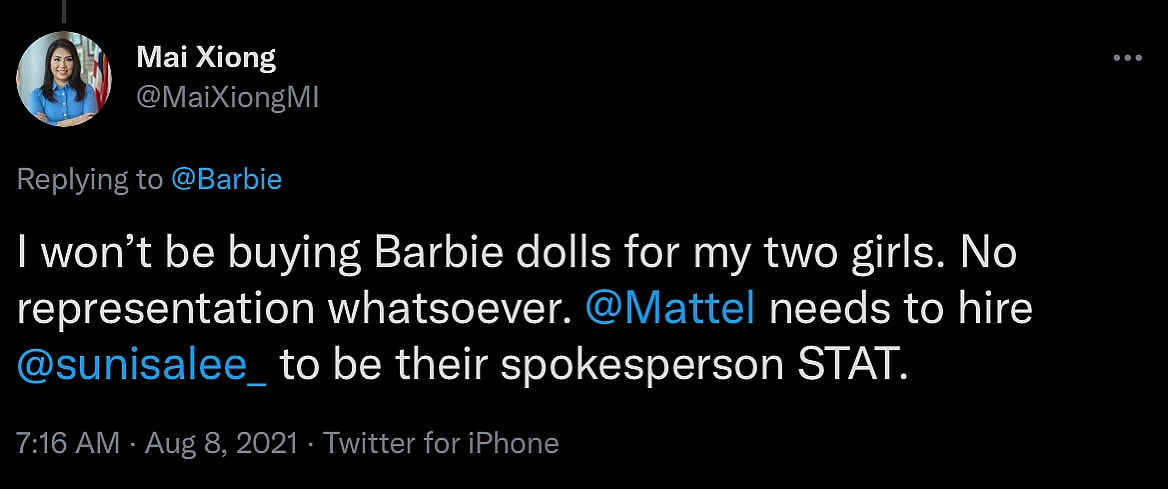 “I won’t be buying Barbie dolls for my two girls,” declared @MaiXiongMI. “No representation whatsoever. @Mattel needs to hire [Asian Olympic athlete Sunisa Lee] @sunisalee_ to be their spokesperson STAT.”
