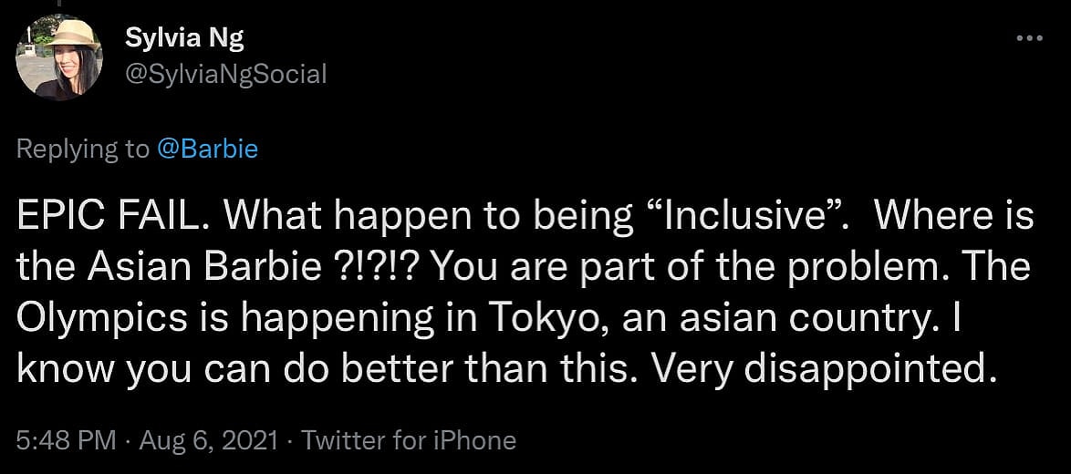 @SylivaNgSocial declared that Mattel’s Barbie line was an “EPIC FAIL,” asking, “What happen to being ‘Inclusive’. Where is the Asian Barbie ?!?!?: