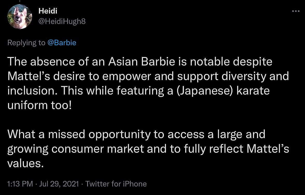 “The absence of an Asian Barbie is notable despite Mattel’s desire to empower and support diversity and inclusion. This while featuring a (Japanese) karate uniform too!”, wrote Twitter user @HeidiHugh8. “What a missed opportunity to access a large and growing consumer market and to fully reflect Mattel’s values.”