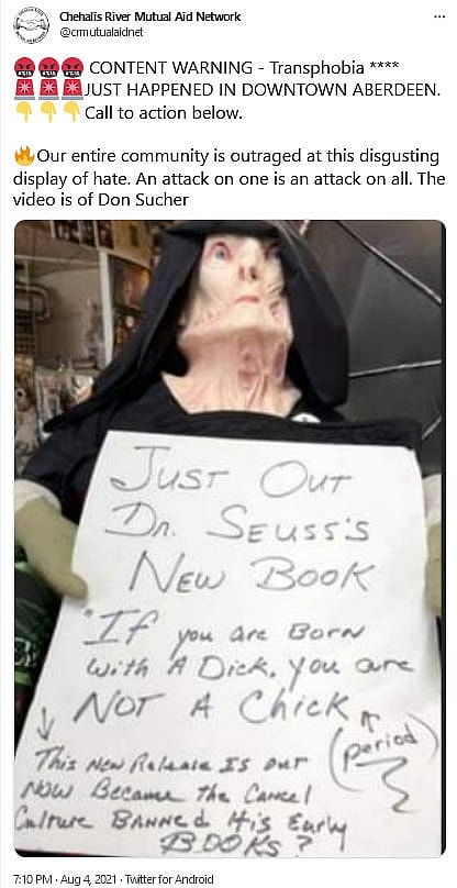 According to photographs, the business, Sucher & Sons Star Wars Shop, had displayed a sign which read, “Just out, Dr Seuss’s new book: If you are born with a dick, you are NOT a chick (period). This new release is out now because the cancel culture banned his early books?”