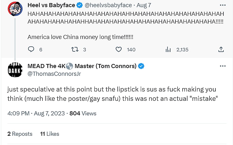 When YouTuber Heel vs Babyface posited, “America love China money long time!!!!!!”, Connors responded, “just speculative at this point but the lipstick is sus as f**k making you think (much like the poster/gay snafu) this was not an actual ‘mistake.'”