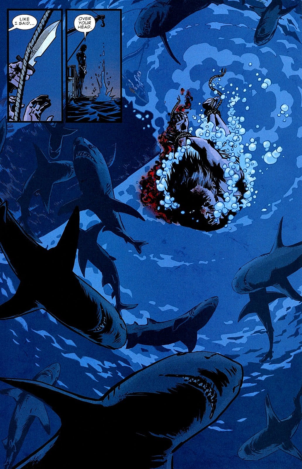 Arnold Lewis eventually gives up the name of Hector Risso who works for the Mexican Mob. If he was expecting any kind of leniency, he doesn’t really know Frank Castle. The blood in the water eventually attracted a number of sharks and Frank Castle let’s them have quite a big meal as he drops Arnold into the water.