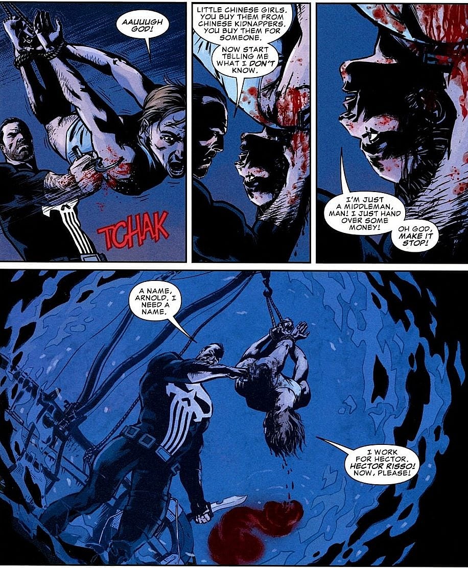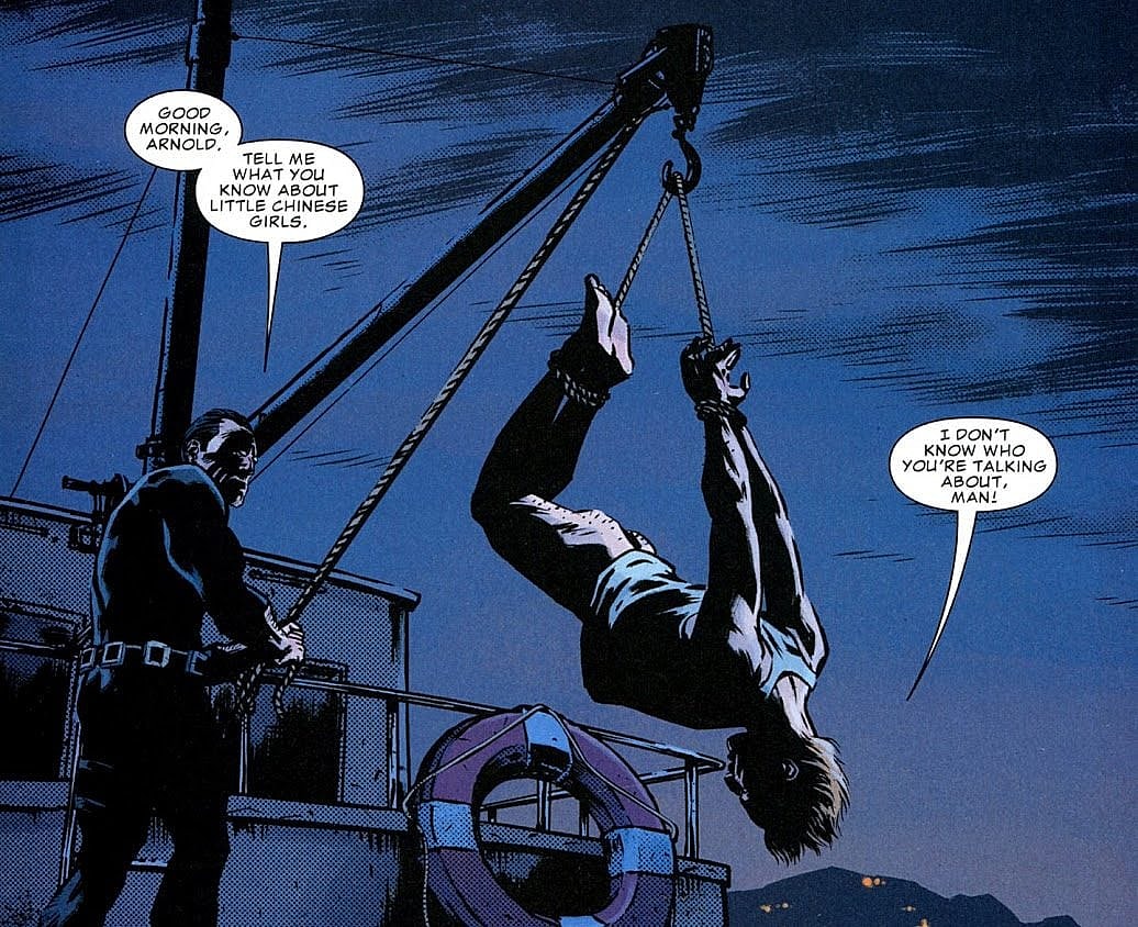 In the pages of Untold Tales of the Punisher Max #4 by Nathan Edmondson and Fernando Blanco, Frank Castle is on the trail of a number of sex traffickers. His first stop is a man named Arnold Lewis who makes his home in the San Diego Marina. Castle sneaks aboard his yacht and rips him away from the two women he is with on his bed. Frank then hogties him and puts him on a crane.