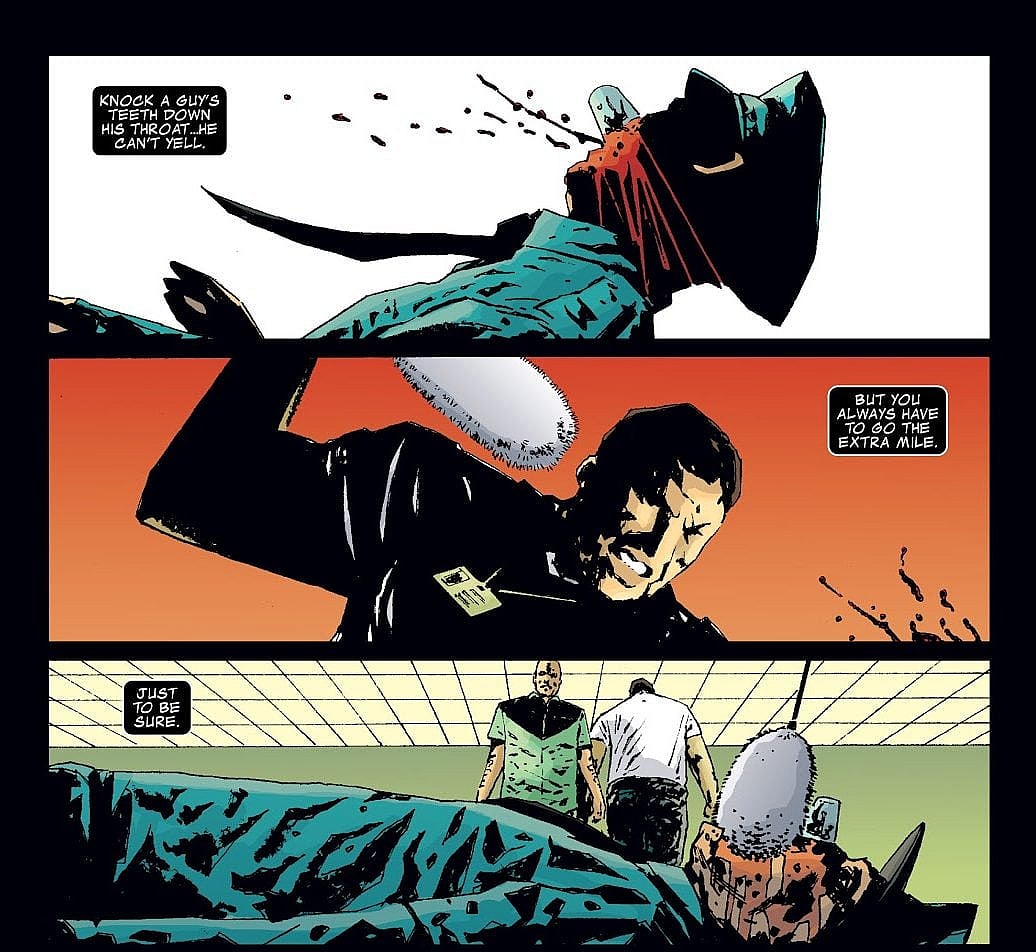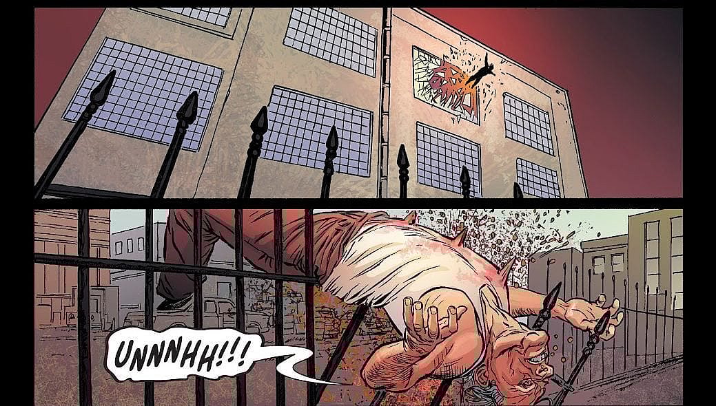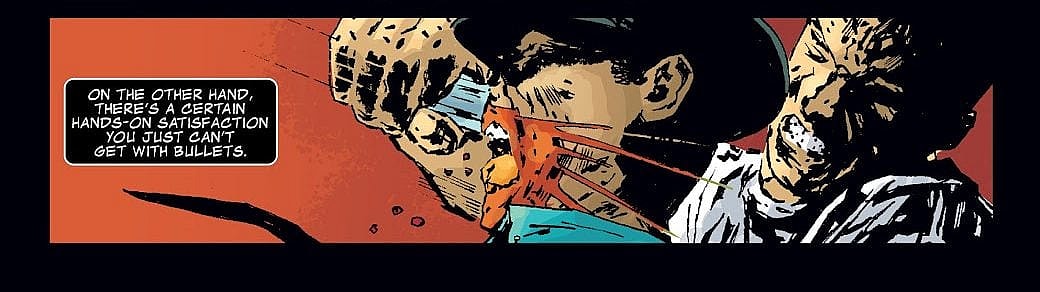 In the pages of Punisher Max #6, Frank Castle has perched himself on top of a high rise and picking off wise guys and mafia members left and right. However, one of them gets through and is able to incapacitate his partner, Micro. Frank confronts the wise guy and the two go at each other like rabid dogs exchanging blows left and right. The wise guy even pulls out a knife and begins stabbing Castle. However, Frank won’t be deterred. He lifts the criminal onto his back and chucks him out a window onto a spike fence below. Frank then jumps down and lands right on top of him.