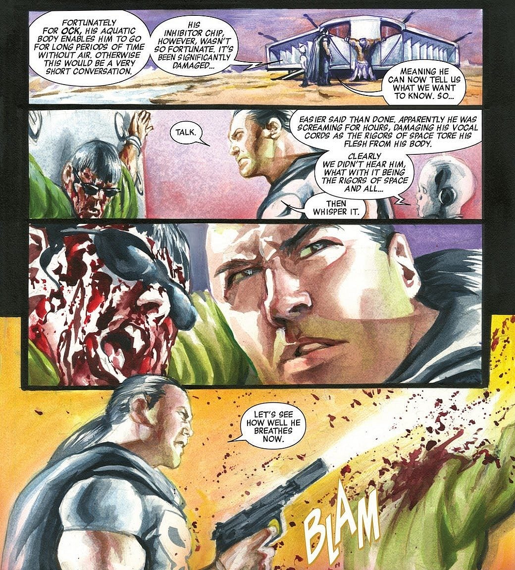 Unfortunately, it appears the little tour around space damaged Doc Ock’s vocal cords, Given that Doctor Octopus is now useless to him, The Punisher puts him out of his misery and blows his head clear off his body with a pistol.