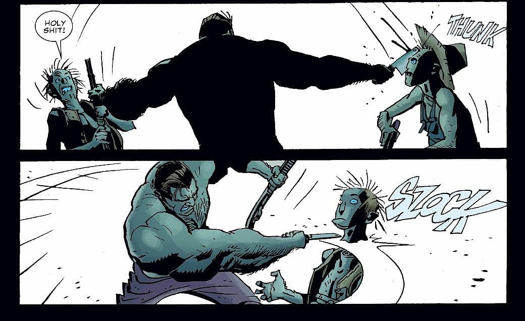 But it’s Frank who does the real dirty work. He uses a butcher’s axe to cleave one of their heads off and then rips a shotgun from another’s arm before chopping his head off with butcher’s axe. Needless to say these guys won’t be coming back to threaten Frank Castle.