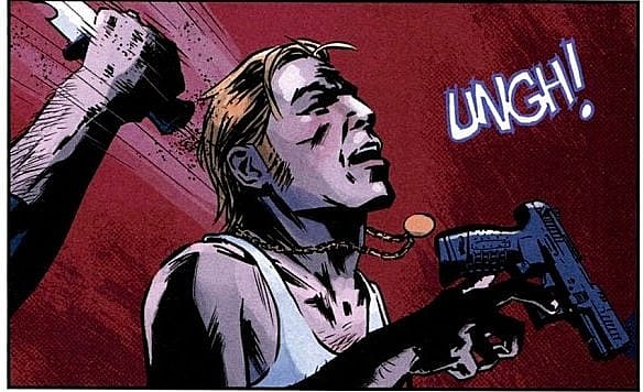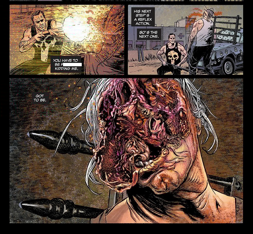We continue in the pages of The Punisher Max #6 when Frank Castle blows off his one-time partner’s head with a shotgun. Micro attempts to persuade Castle to join the CIA’s black ops unit. However, The Punisher declines. But when he finds out that the CIA is dealing arms and heroin out of Afghanistan to fund their operation, Castle decides to punish Micro. After Frank deals with a massive firefight between the CIA and the Mafia, he turns on his one-time partner and blows his head clean off.