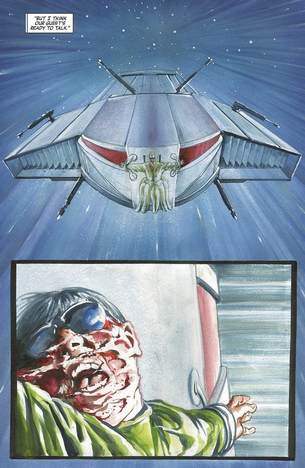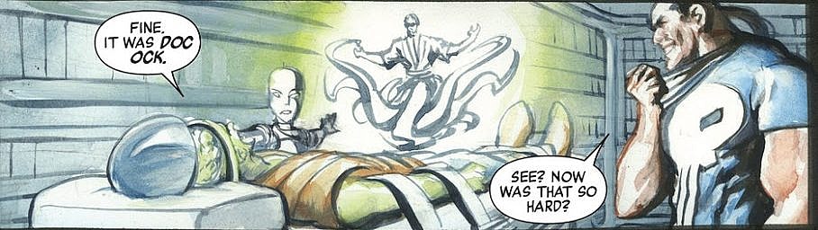 In the pages of Space: Punisher #2 by Frank Tieri and Mark Texeira, Frank Castle is hunting down the Six-Fingered Hand for their involvement in the murder of his family in a galaxy much different than our own. Upon receiving information from the Leader, Frank Castle discovers he was hired by Doctor Octopus. He then proceeds to capture Doc Ock and tie him to the front of his spaceship and give him a nice tour of the galaxy.