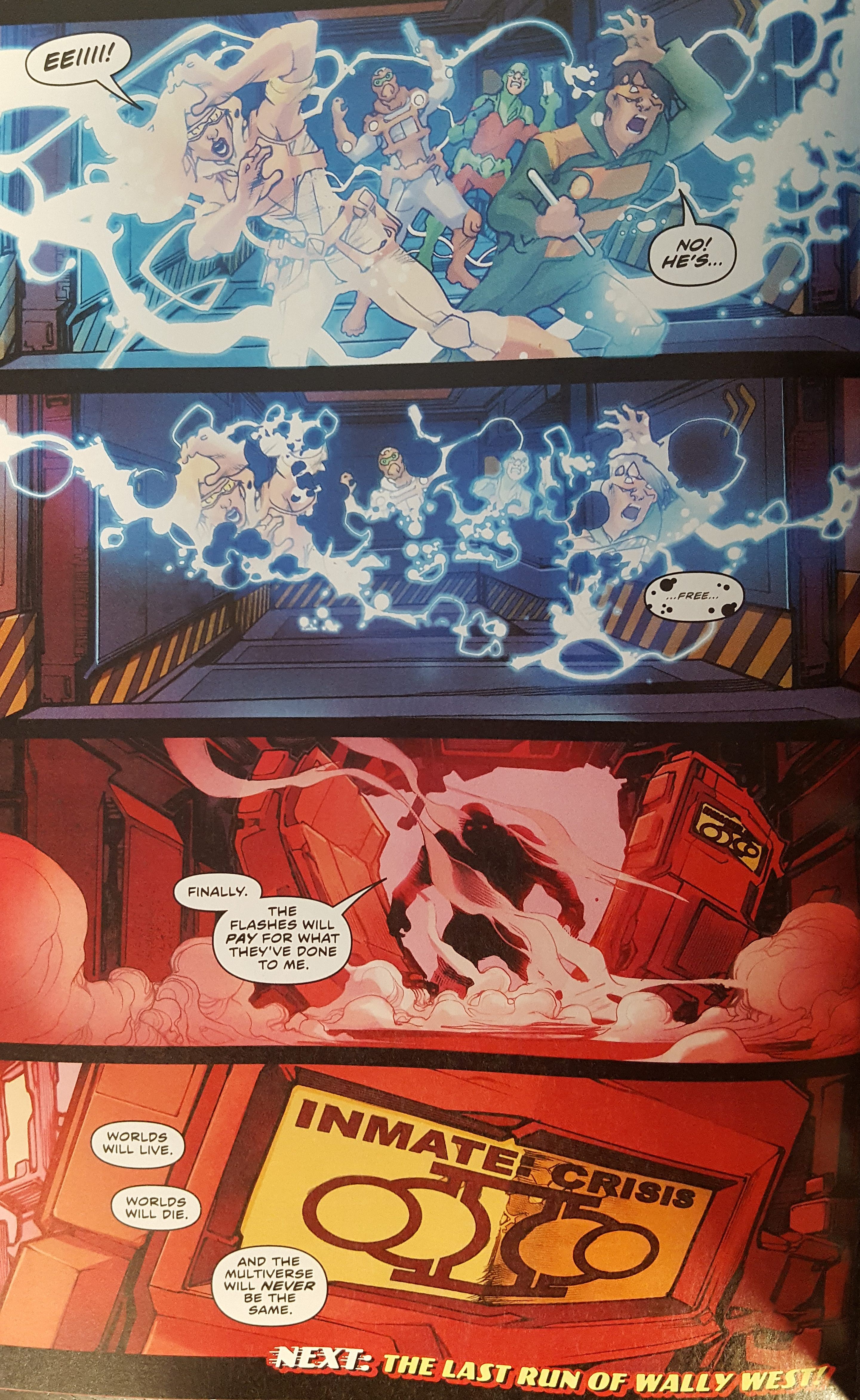 But with Bart’s return, it appears they have also unleashed an extremely dangerous threat. Commander Cold’s team of Renegades in the 25th Century reveal Eobard Thawne had created a prison to hold one person and that person has escaped. Not only did he escape, he completely atomized Cold’s team of Renegades appearing to completely eliminate them. Just who could this villain be? It’s unclear but his prison cell reads, “Inmate: Crisis.”
