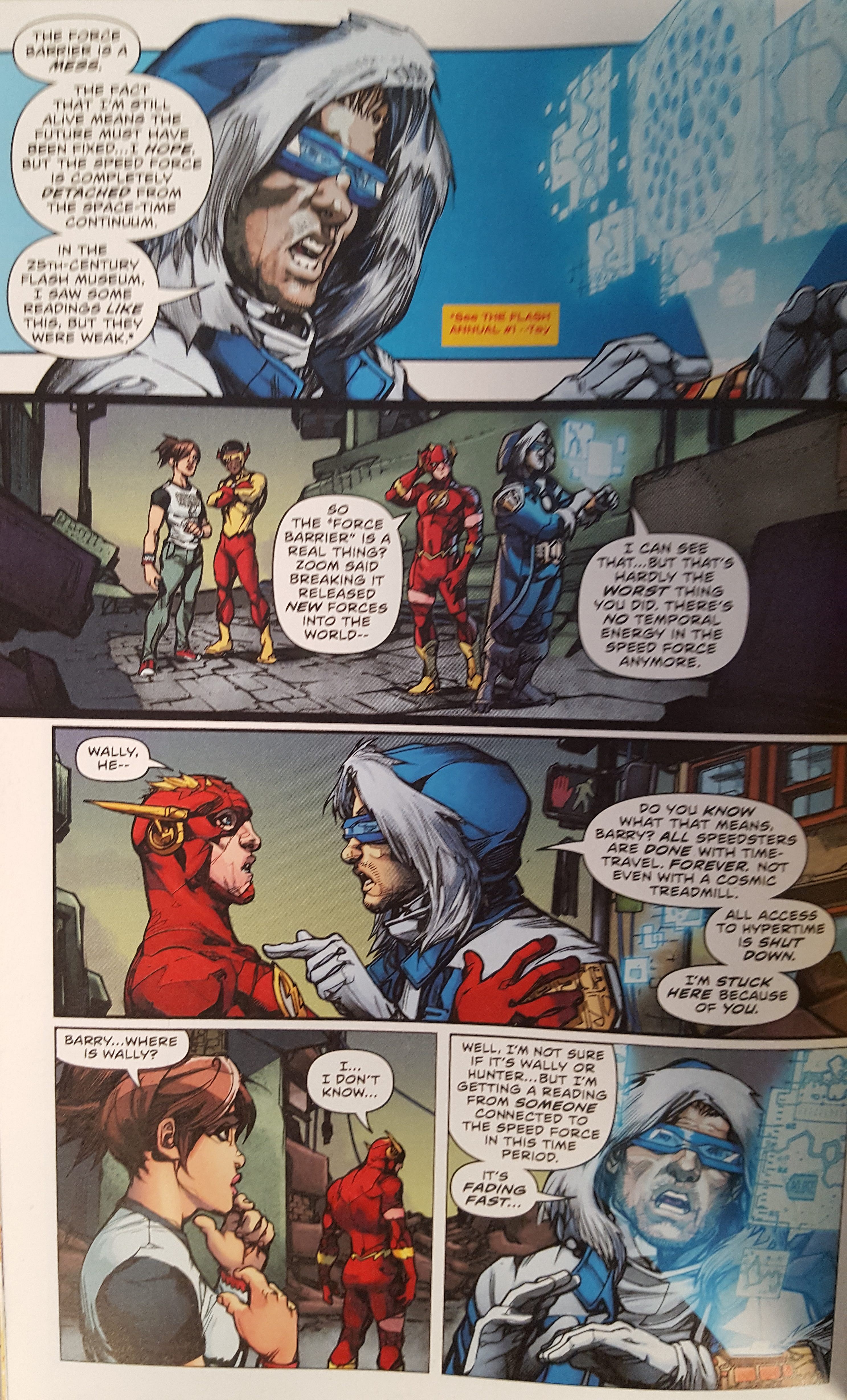 “There’s no temporal energy in the Speed Force anymore. Do you know what that means, Barry? All Speedsters are done with time-travel. Forever. Not even a cosmic treadmill. All access to Hypertime is shut down.”