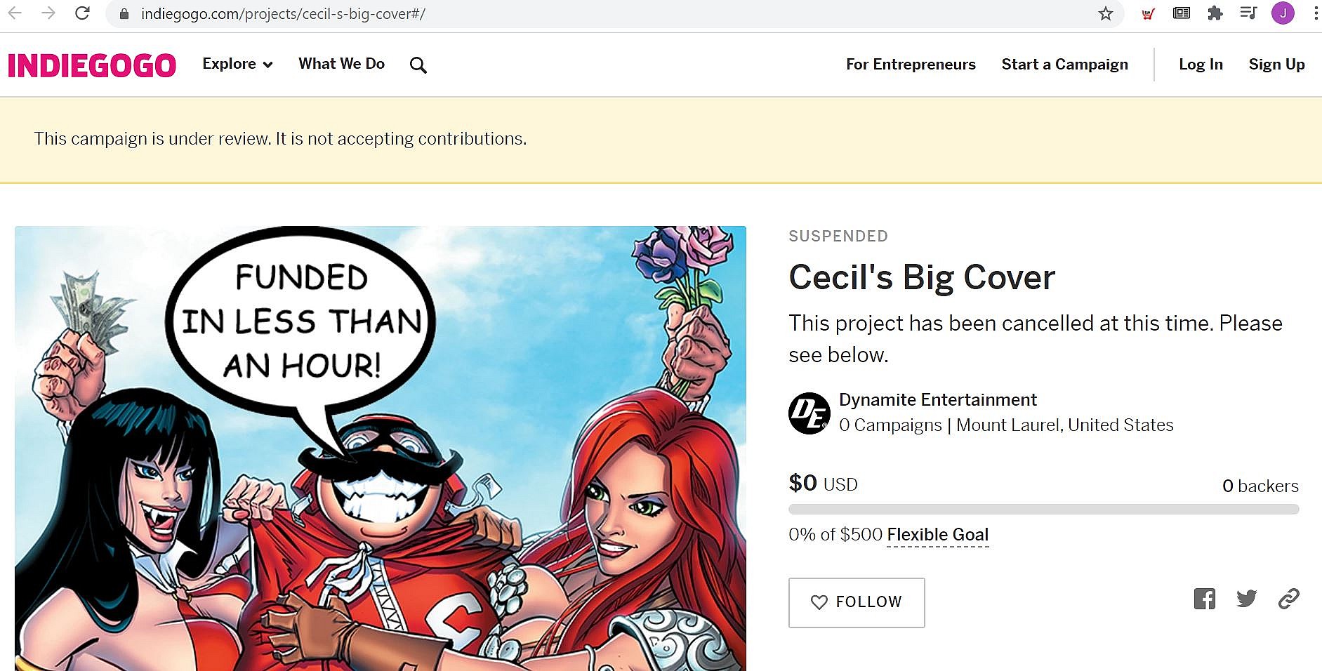 Dynamite Entertainment had a number of IndieGoGo campaigns still running including “Cecil’s Big Cover” despite them announcing that it was canceled.