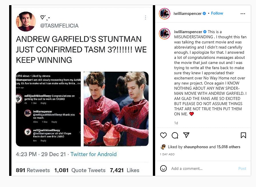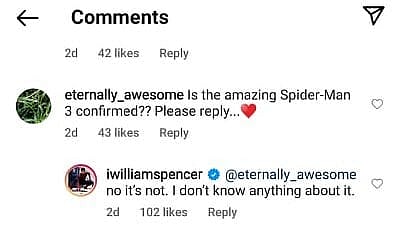 Due to the widespread nature of the tweet sharing his initial Instagram comment, Spencer would share a new Instagram post making it crystal clear he was not confirming the development of The Amazing Spider-Man 3.