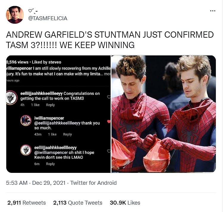 This comment would then be shared to Twitter by user TASMFELICIA claiming, “ANDREW GARFIELD’S STUNTMAN JUST CONFIRMED TASM 3?!!!!!! WE KEEP WINNING.”