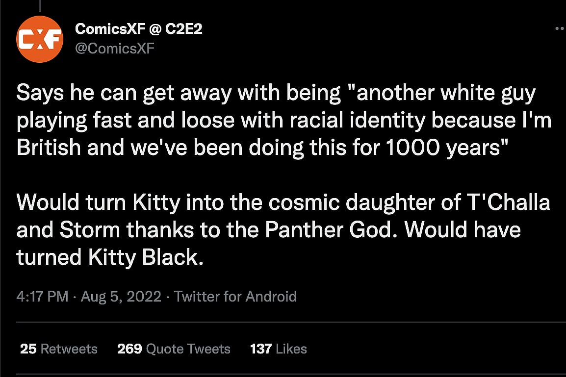 “Says he can get away with being “another white guy playing fast and loose with racial identity because I’m British and we’ve been doing this for 1000 years,” Claremont reportedly joked, doubling down on his stance about identity politics in media.